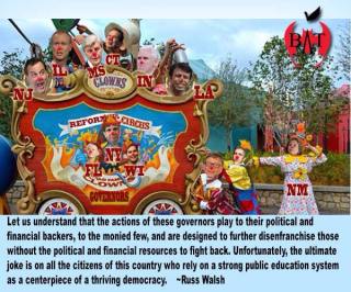 Like all the other governors listed here, Cuomo has chosen to ignore the real reasons for educational problems: poverty, segregation and inequitable distribution of resources and has focused his sights on those miscreant teachers, who have only dedicated their lives to working with children. Children whose welfare and potential these governors ignore at every turn. Let us understand that the actions of these governors play to their political and financial backers, to the monied few, and are designed to further disenfranchise those without the political and financial resources to fight back. Unfortunately, the ultimate joke is on all the citizens of this country who rely on a strong public education system as a centerpiece of a thriving democracy.
